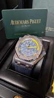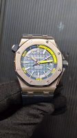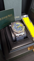 Audemars Piguet 愛彼 15710 ST 皇家橡樹 300米潛水錶 42MM 專賣店限定錶款 Cal.3120自動上鏈機械機芯 新款透明錶背 動能儲存60H 雙色藍格紋黃色數字面板 原廠盒單齊全97%新(另付1條全新黃色膠帶如圖)